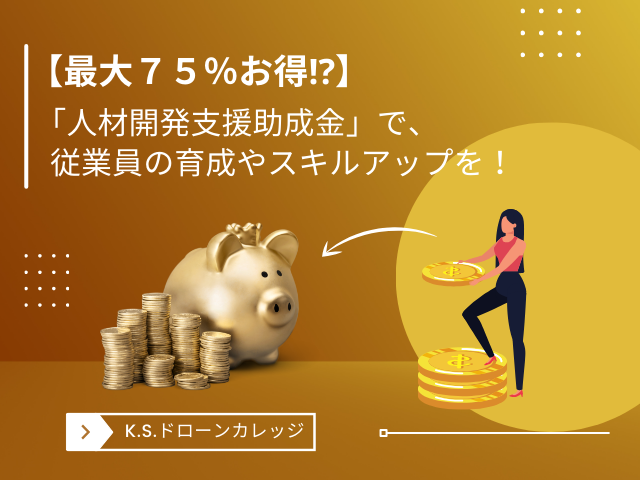 普段から人材開発や従業員のスキルアップに頭を悩ませている企業も多いのではないでしょうか。 本日は、助成金を活用することで従業員育成やスキル向上を効率的に行うことができるお得な情報をお伝えしていきます。 従業員のスキルアップにドローンスクール活用をお考えの企業様には、昨年12月に新設された人材開発支援助成金「事業展開等リスキリング支援コース 」のご利用をおすすめします。こちらを活用すれば、なんと、最大で教育費用の75%の助成を受けることができるのです。 では、さっそく「事業展開等リスキリング支援コース 」の内容や助成条件等について、より詳しくご紹介いたします! なぜ企業に「事業展開等リスキリング支援コース」をお勧めするのか そもそも人材開発支援助成金とは、厚生労働省の管轄下の事業主が、雇用する労働者に対し、職務に関連した専門的な知識や技能を習得させるために負担する、職業訓練等の経費を助成する制度です。 本日ご紹介する「事業展開等リスキリング支援コース」は人材開発支援助成金の中のNew Faceです。もちろんドローンスクールの費用も対象になっています。この助成金を利用すれば、企業様はスクールの講習費用の最大75%を助成してもらえます。(※企業規模など条件あり) 対象となる企業は、大企業から中小企業までと幅広く設定されていますが、助成額や助成率が企業規模によって異なることを覚えておいてください。 「事業展開等リスキリング支援コース」は、①事業展開に伴う人材育成あるいは②業務の効率化や脱炭素化に取り組むデジタル・グリーン化に対応した人材育成に取り組む事業主に訓練経費や訓練期間中の賃金の一部を高率助成により支援する制度です。 例えば、建設業を営む会社がドローンを活用して点検事業を始めたい、あるいは農業を営む方がドローンを利用して農薬散布を行いたい、などがこの助成金制度に該当します。 そんな「人材開発支援助成金リスキリング支援コース」はぜひK.S.ドローンカレッジで活用するのがおすすめです! その理由は大きく3つあります。 ◆【1】助成率75%!? お得に従業員の人材開発が行える ◆